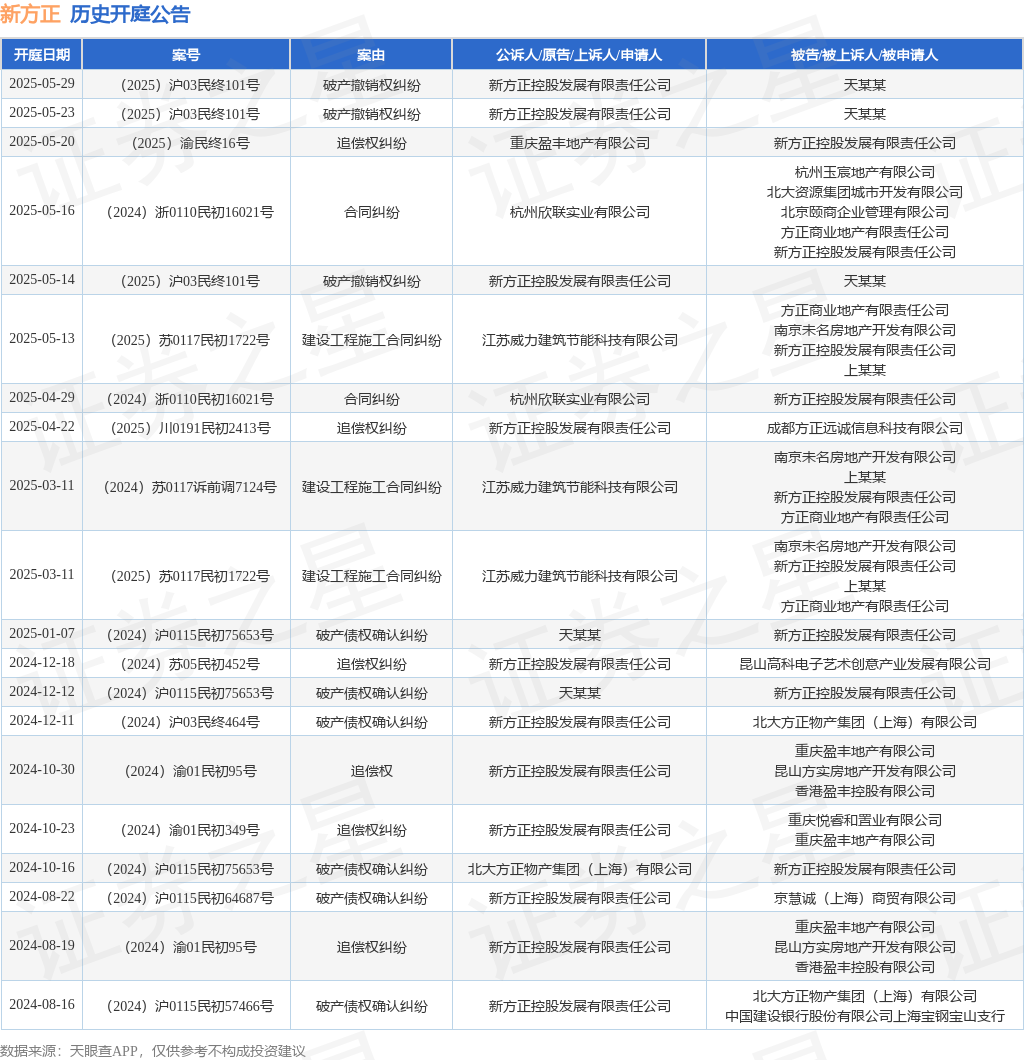 案号:(2025)沪03民终101号审理法院:上海市第三中级人民法院案由:破产撤销权纠纷当事人信息: 原告/上诉人:新方正控股发展有限责任公司 被告/被上诉人:天某某开庭日期:2025年5月29日根据统计,近一年内以新方正控股发展有限责任公司为当事人的历史开庭公告有22则,其中案由为“破产债权确认纠纷”的公告以6则居首,其次为“追偿权纠纷”有6则,“建设工程施工合同纠纷”有3则。历史开庭公告(前20条)如下: